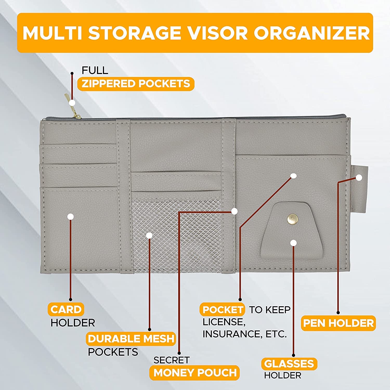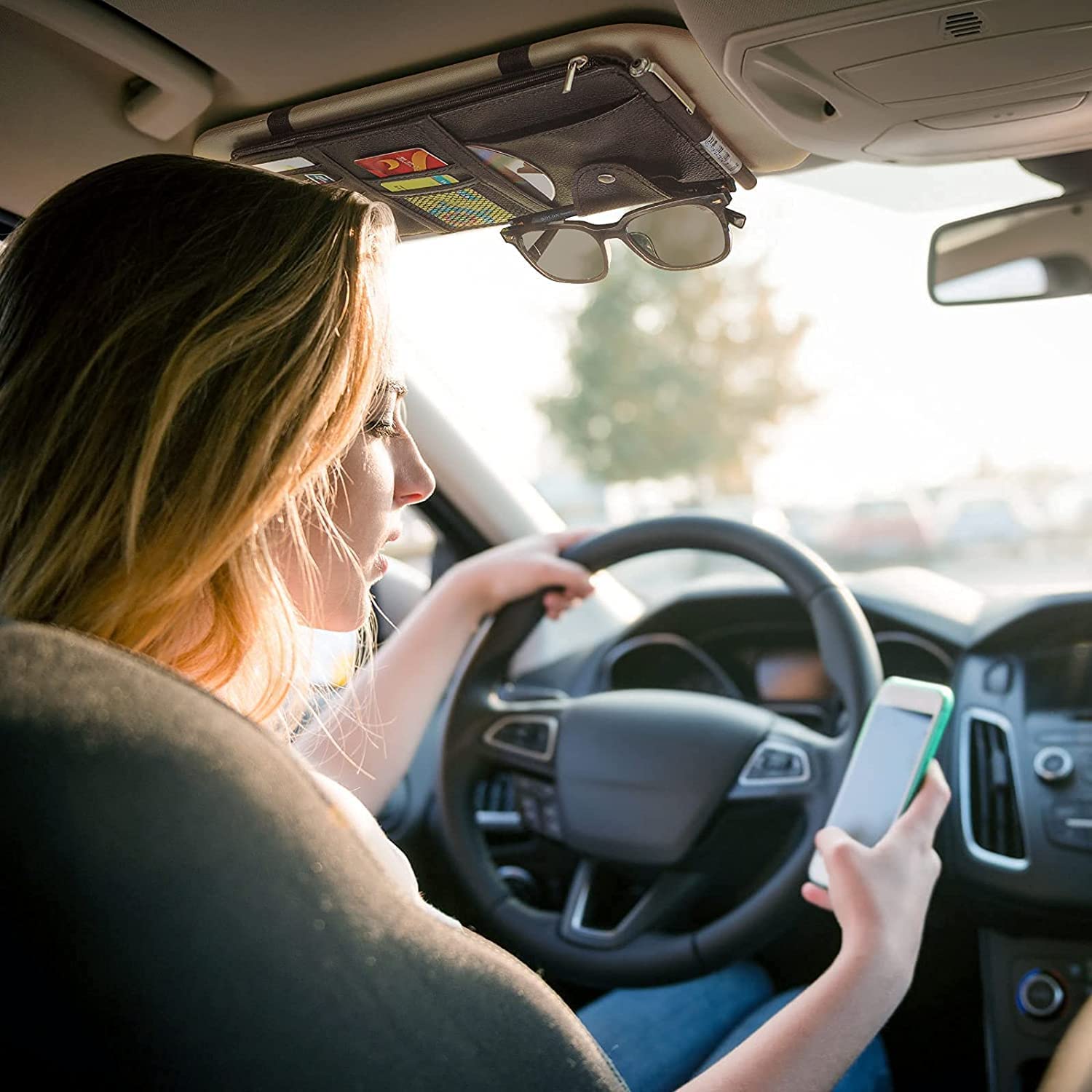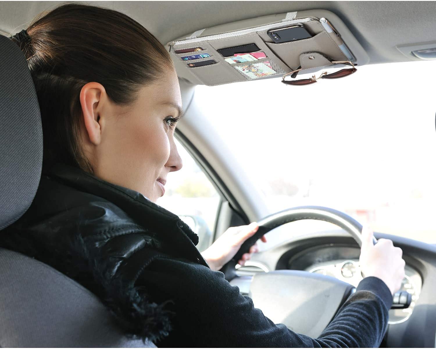 Designed for convenience, this visor organizer neatly stores your driving essentials, ensuring a clean and organized car interior. From documents to sunglasses, everything stays secured in designated pockets for quick access.