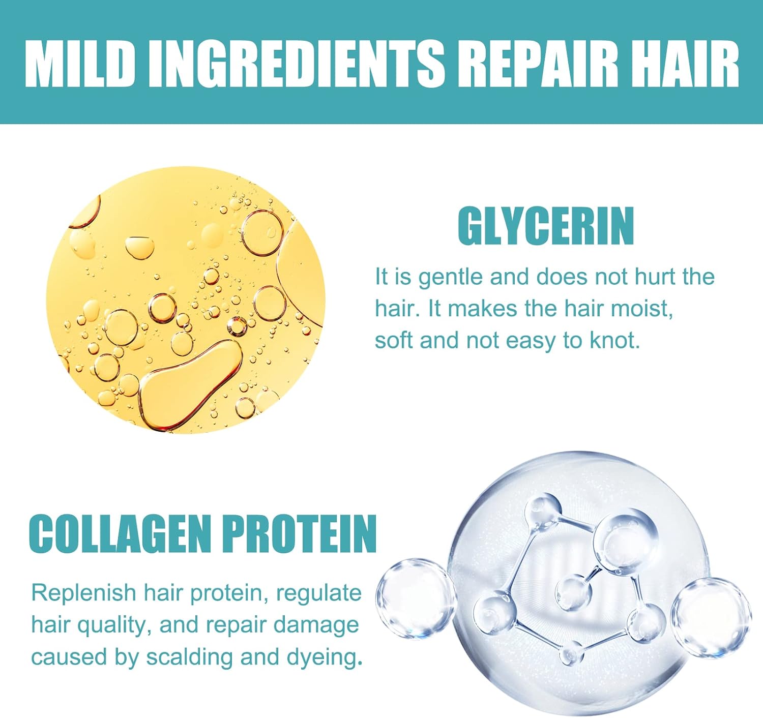 Collagen strengthens hair from root to tip. Plant extracts and glycerin restore moisture and elasticity, leaving hair soft, shiny, and healthy. The gentle, safe formula provides salon-worthy smoothness without harsh chemicals.