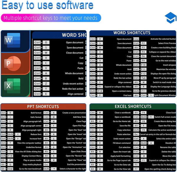 Ptronics Gaming Non-Slip Keyboard Mat is designed with an office software shortcut key pattern that is easy to read and use. This pattern allows users to quickly and easily access frequently used commands and functions.
