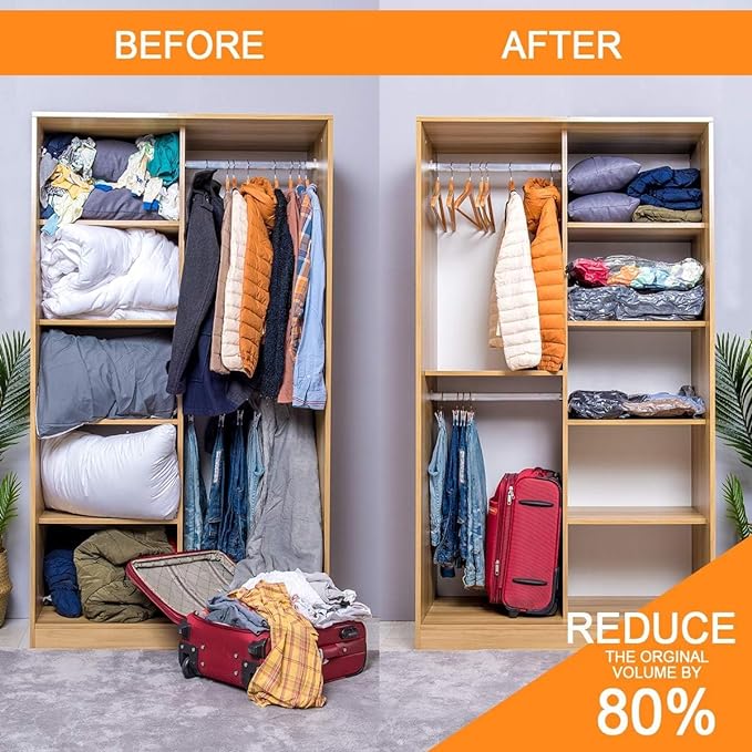 Take advantage of our special offer: each pack comes with a free hand pump and free delivery! Maximize your storage space and keep your items organized with our Space Saver Reusable Vacuum Storage Bags. Order now and enjoy the convenience and efficiency of our premium storage solution.